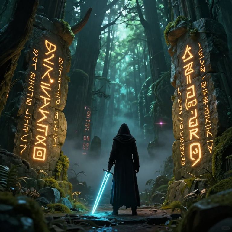 Digital art: Dark-robed figure with glowing blue sword stands between glowing stone pillars in misty, enchanted forest, with ancient runes illuminated.