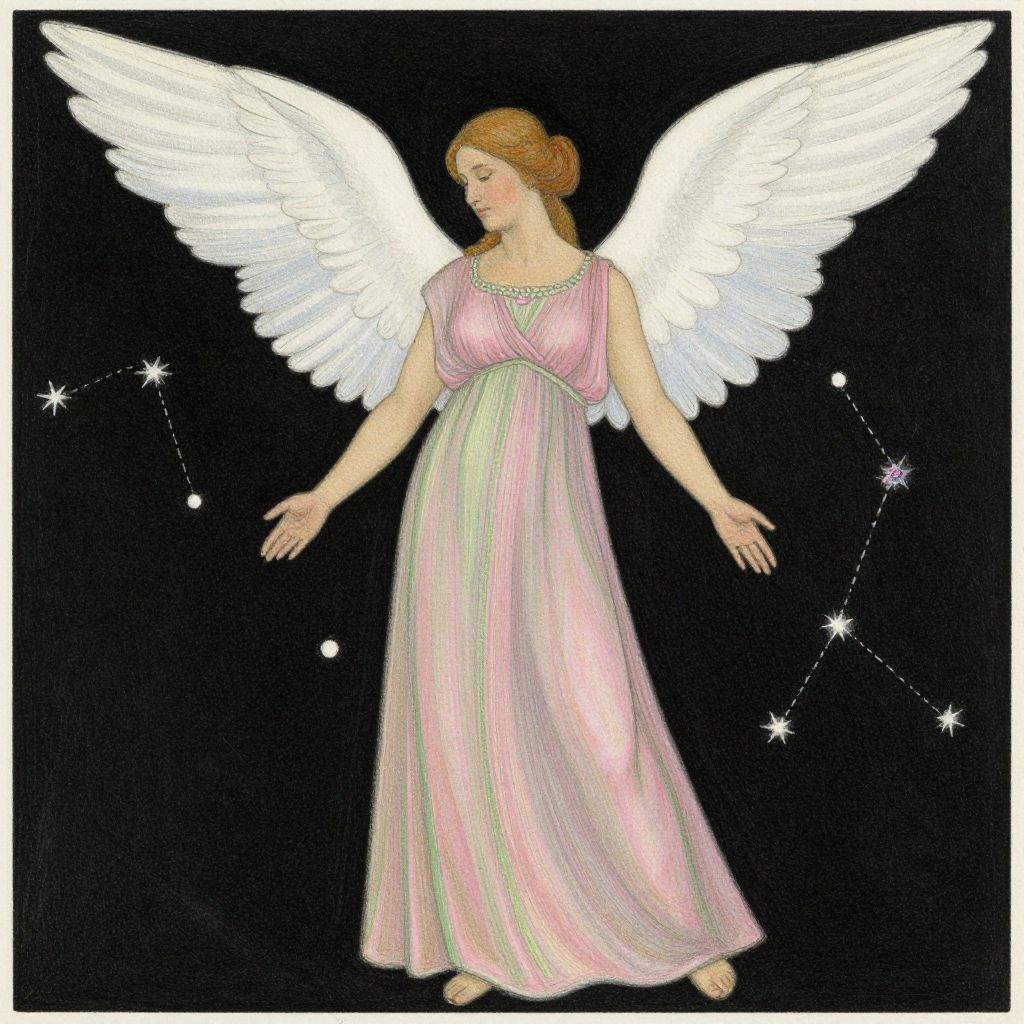 Digital illustration of a serene angel with white wings, pink gown, and brown hair, floating against a black background with glowing star constellations.