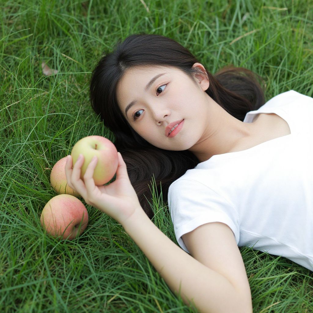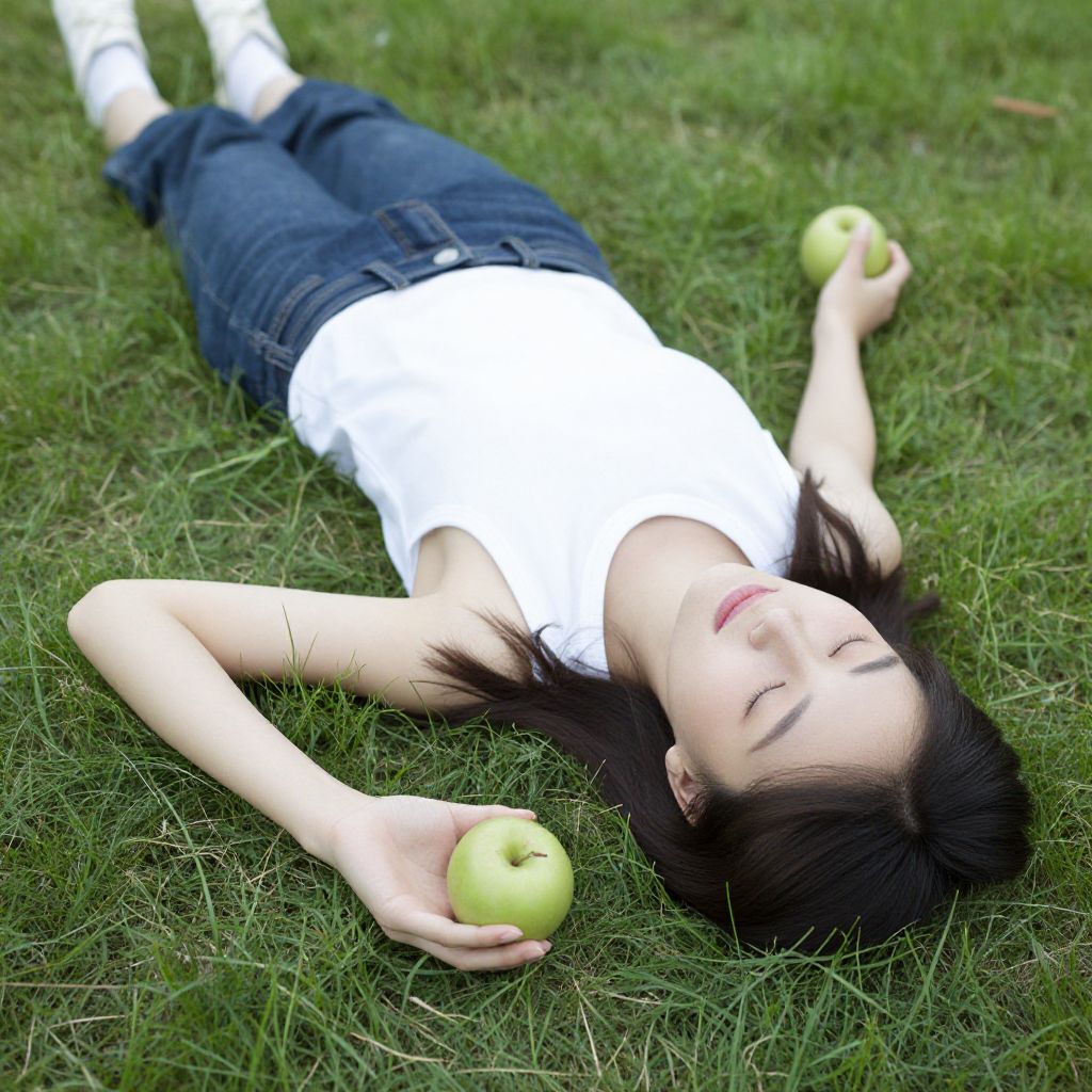 Photograph of an Asian woman with black hair, lying on grass, eyes closed, wearing white shirt and blue jeans, holding two green apples.
