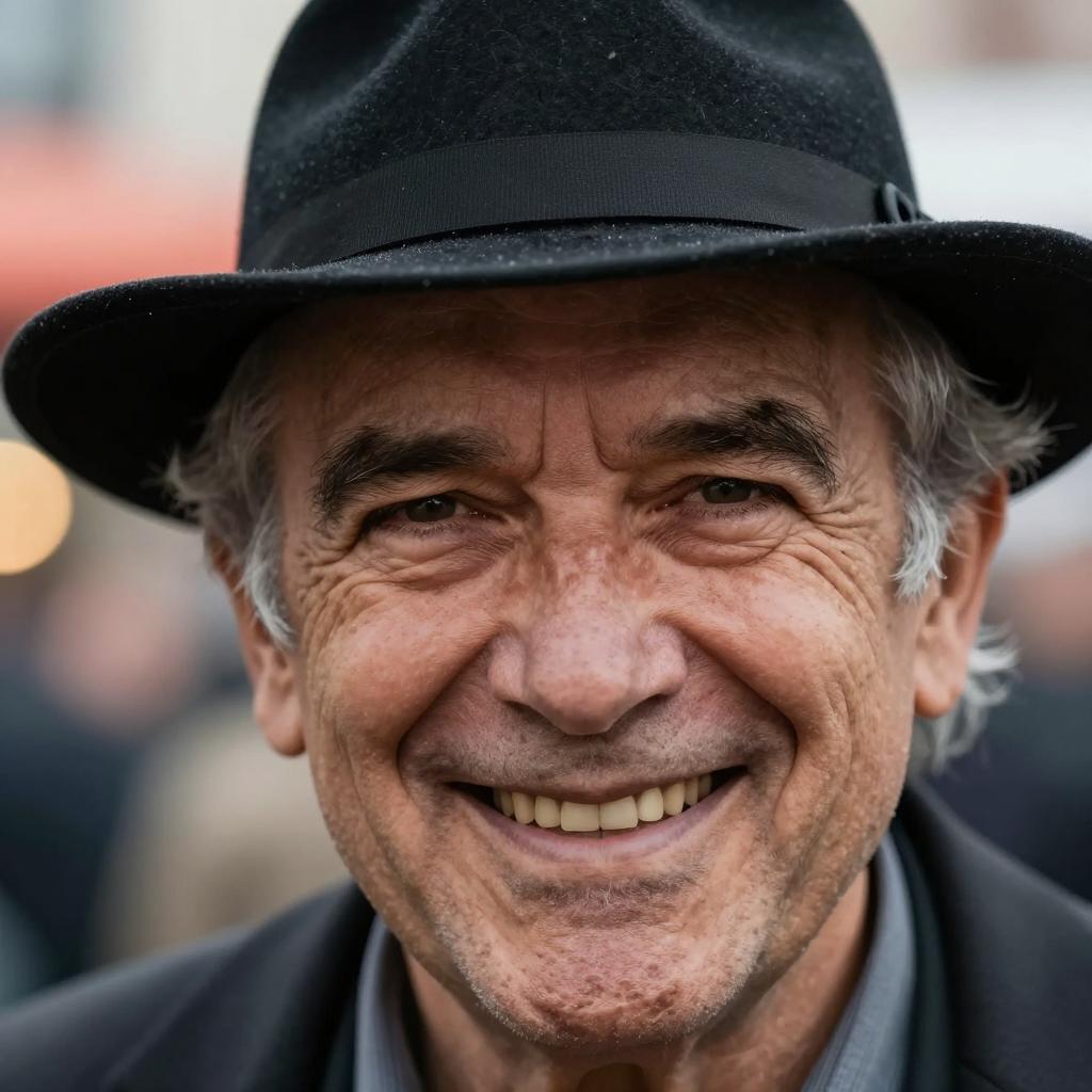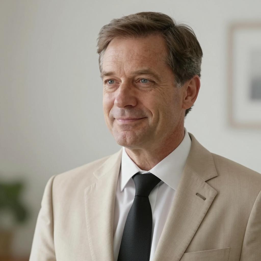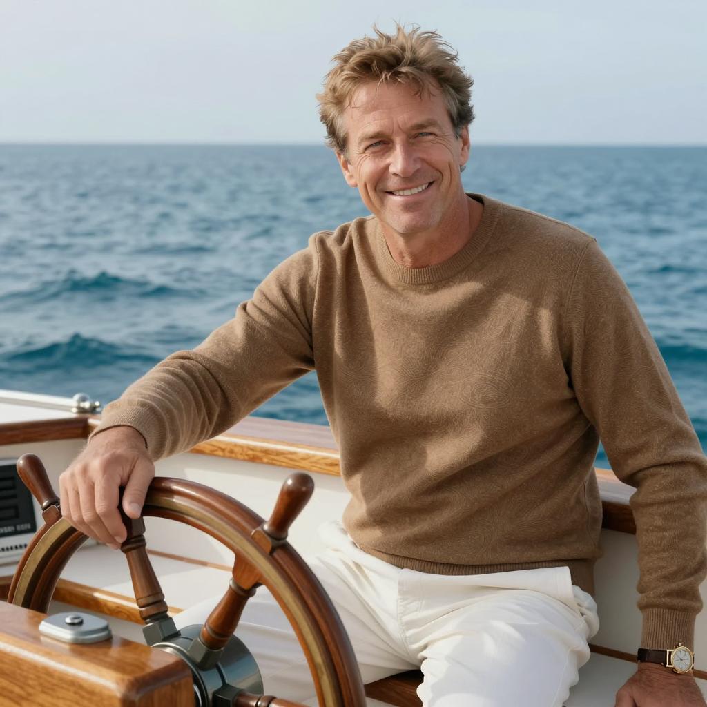 Middle-aged man with short, light brown hair, holding a silver coin with "BOYS" and a clock face. He has a slight smile, wrinkles on his face, wearing a brown suit jacket and white shirt. Background: blue-lit steps, dark foliage. Close-up, eye-level shot.