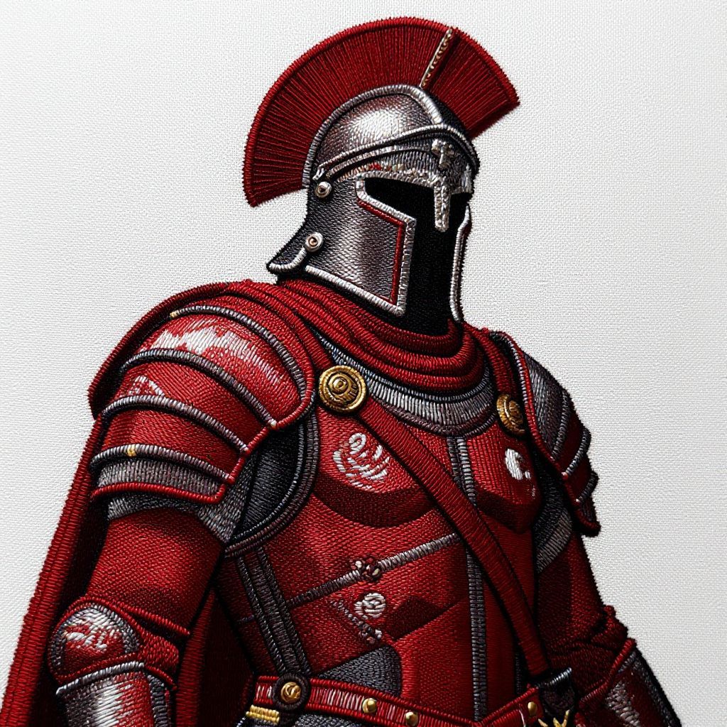 Embroidery dark, intimidating roman general wearing red and grey armor and large helmet, style of D&D,