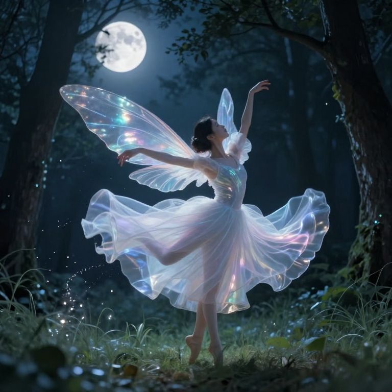 An ethereal dancer graces a moonlit forest glade with her iridescent gossamer wings, pirouetting across the scene in an enchanting display of fluid grace reminiscent of both Matisse's figure studies and Studio Ghibli's whimsical fantasy. Captured from a low-angle perspective, this digital art piece emphasizes the delicate balance between weightlessness and movement, as the dancer's luminous wings reflect the moon's silvery glow, casting an alluring spell over the mystical scene. The ethereal ballet unfolds, painting shimmering trails of stardust in the cool night air, leaving an awe-inspiring impression on all who bear witness to her celestial performance.