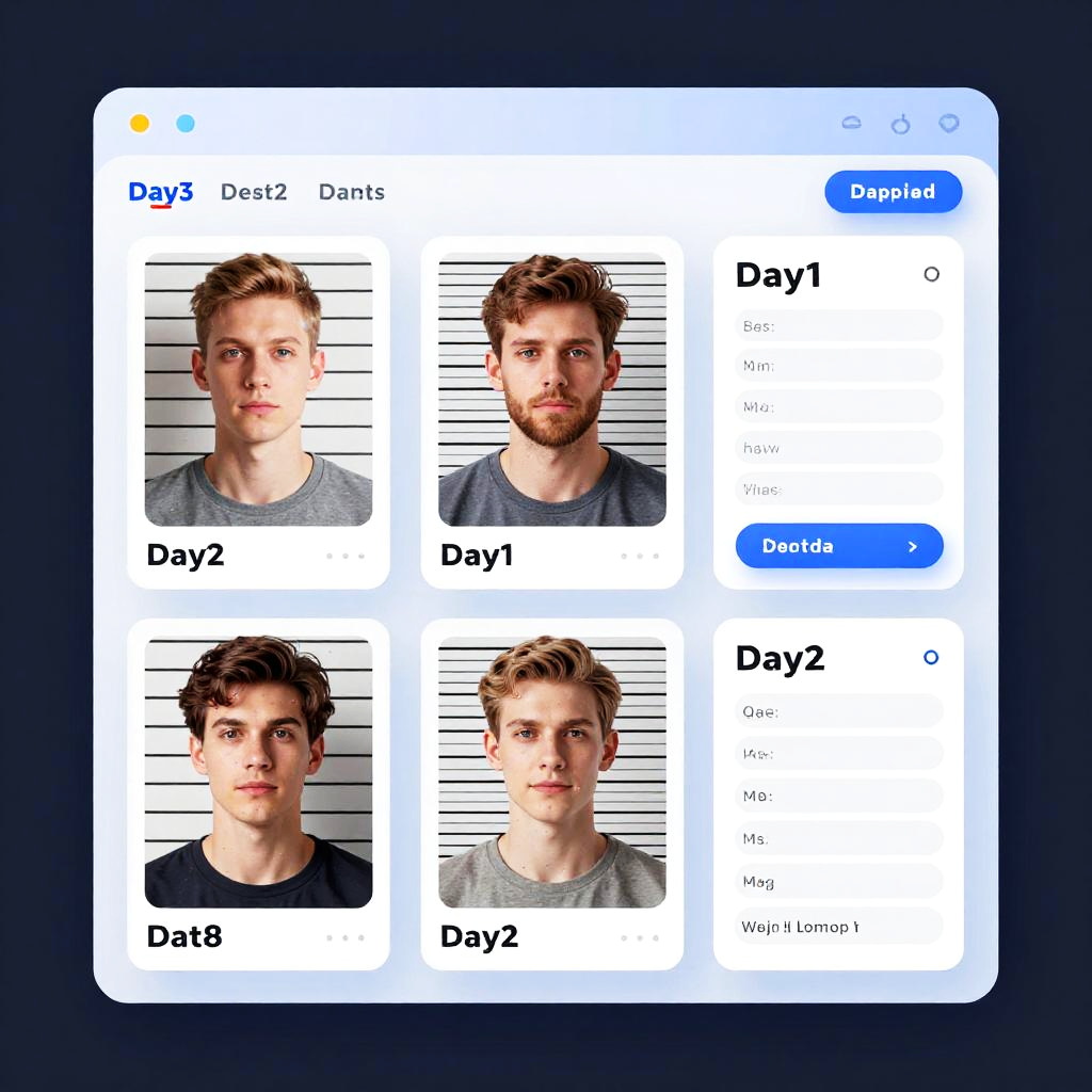 Futuristic mugshot template maker software showing various mugshot frame designs, customizable date and number fields, clean interface with smooth gradients and glowing accents, a concept art for digital artists and graphic designers.