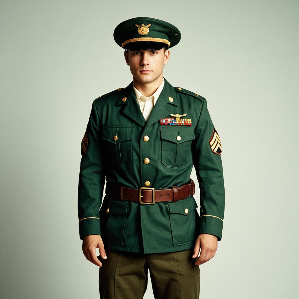 Toy army soldier costume,1boy, male focus, solo, hat, uniform, military uniform, belt, military, green headwear, jacket, military hat, arms at sides, long sleeves, pants, green jacket, closed mouth, green pants, pocket, brown belt, buttons, looking at viewer, realistic, standing, peaked cap, breast pocket, black hair, cowboy shot, military jacket, shirt