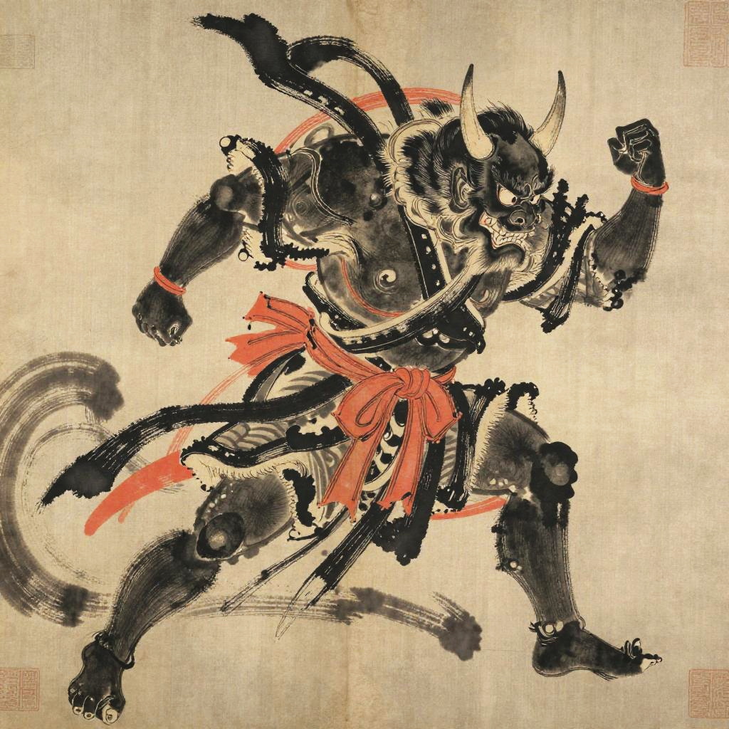 Traditional Japanese ink drawing of an intense, muscular oni warrior with black armor, red sash, and fierce expression, in dynamic stance.