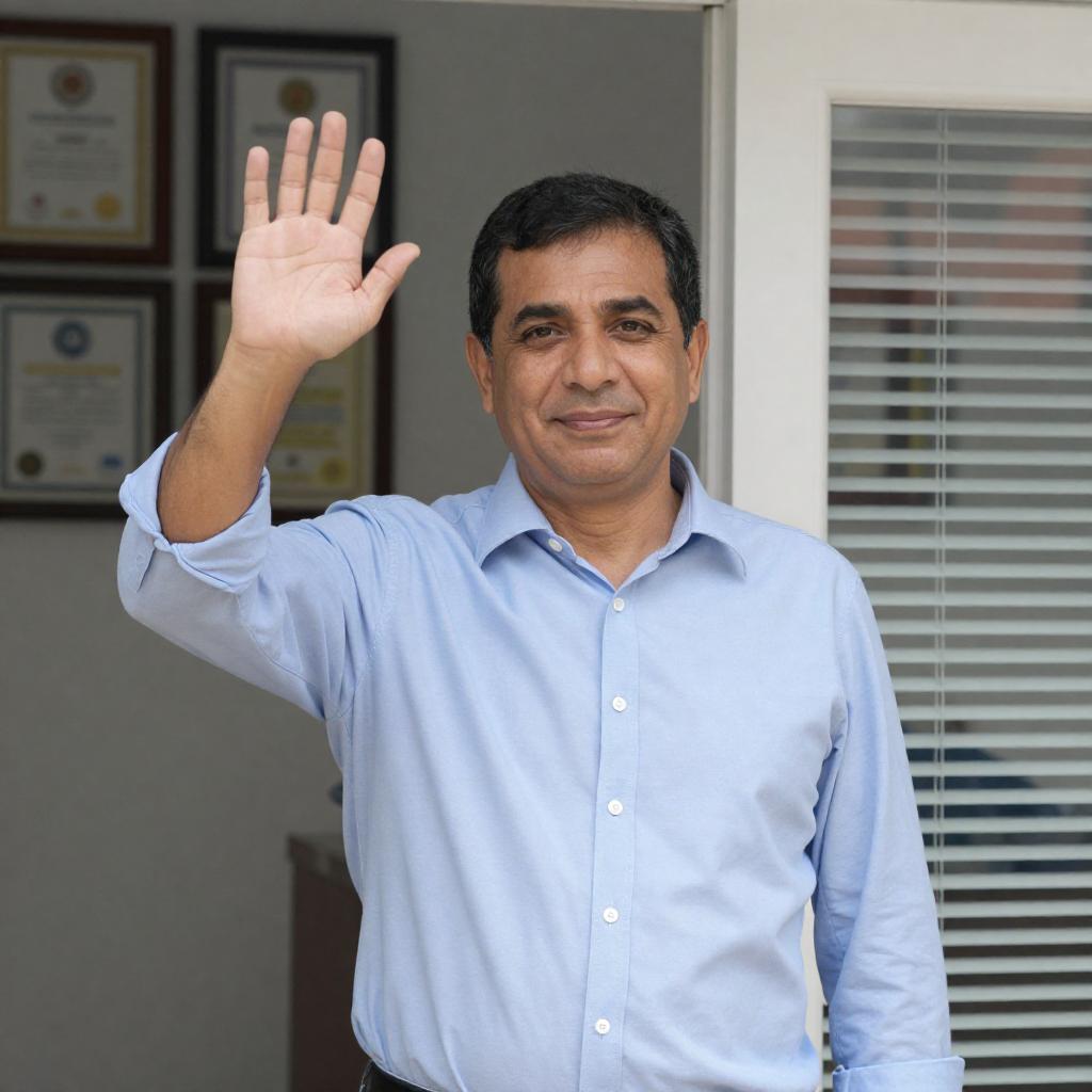 A group of five South Asian men in formal business suits are engaged in a conversation in a dimly lit indoor hallway. The central man wears a gray suit, white shirt, and red tie, gesturing with his right hand while smiling. The others wear dark suits and striped ties, listening attentively. The beige wall behind them features a 'No Smoking' sign.