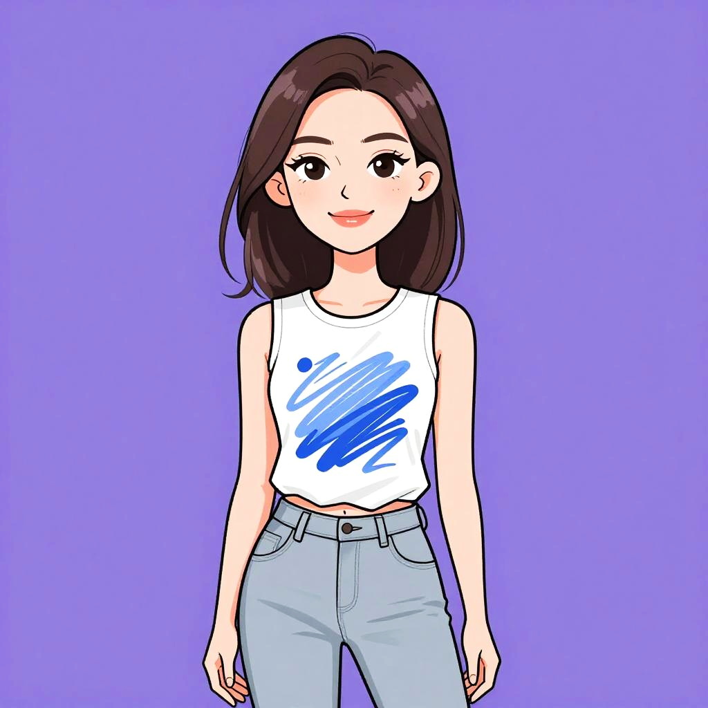 Woman with pretty face and pretty hair. smiling Woman, casual, sleeveless graphic tee with abstract blue and white print, crew neck, light grey skinny jeans. --sref 1467