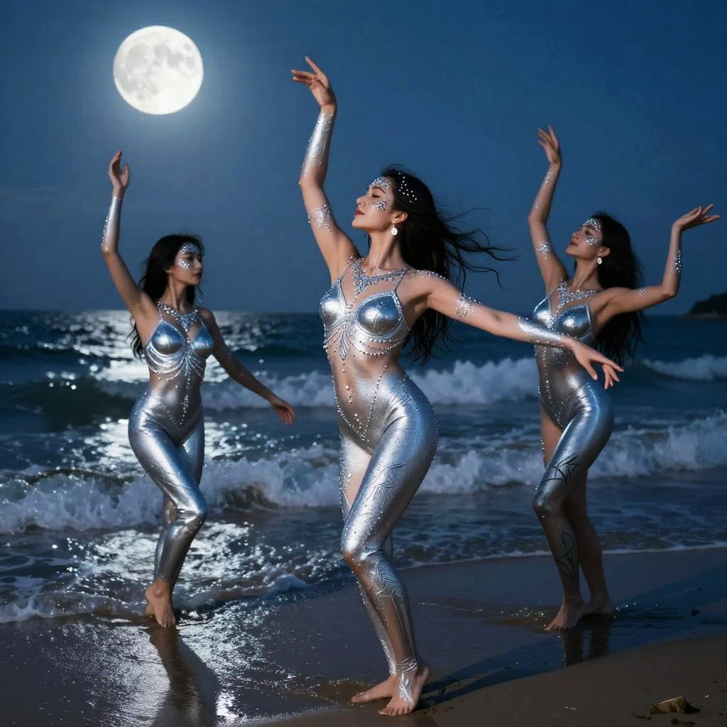 Scantilly clad women dancing on a moonlit beach, shimmering waves, silver and blue hues, intricate body paint, graceful poses, cinematic atmosphere, mystical vibe