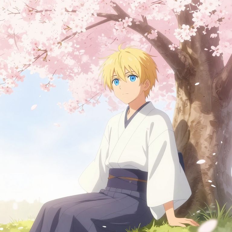 Anime-style drawing of a blonde, blue-eyed boy in a white kimono and navy hakama, sitting under a cherry blossom tree.
