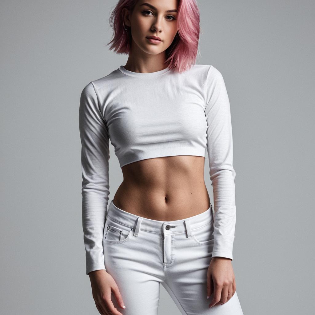 Portrait of a young woman with pink hair wearing a white long-sleeve crop top and white pants. She is standing against a plain grey background, facing the camera with a neutral expression, her midriff and navel visible. The image highlights her slim figure and casual modern fashion style.