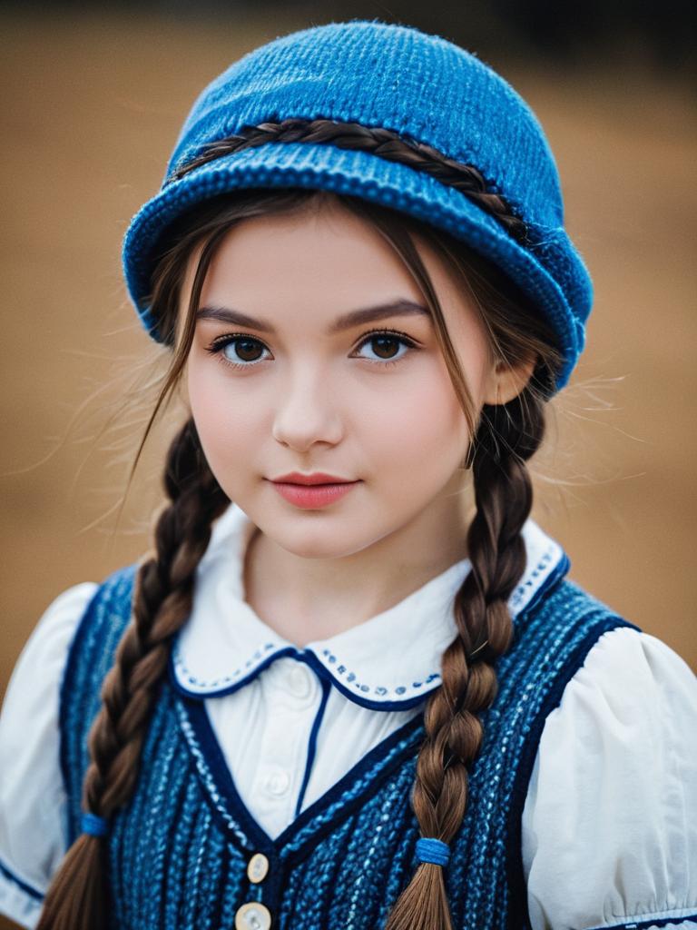 Children clothes costume, 1girl, solo, looking at viewer, brown hair, hat, braid, blurry, blue eyes, blurry background, twin braids, upper body, blue headwear