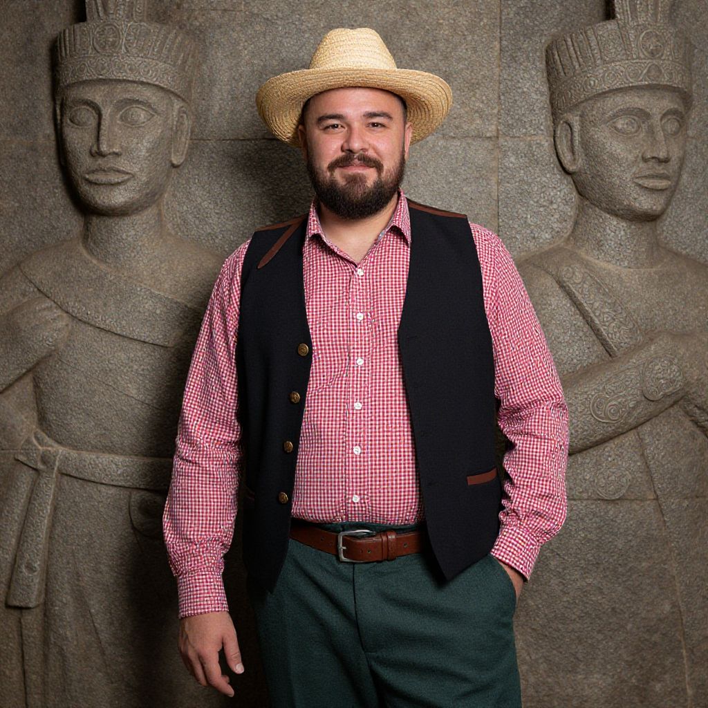 A photograph of a bearded man with a medium build, wearing a straw hat, red and white checkered shirt, black vest with brown leather straps, and dark green pants with a brown belt. He stands in front of a stone wall with carved faces and figures. His right hand is in his pocket, and he's smiling slightly. The lighting highlights the texture of the stone wall and his clothing.