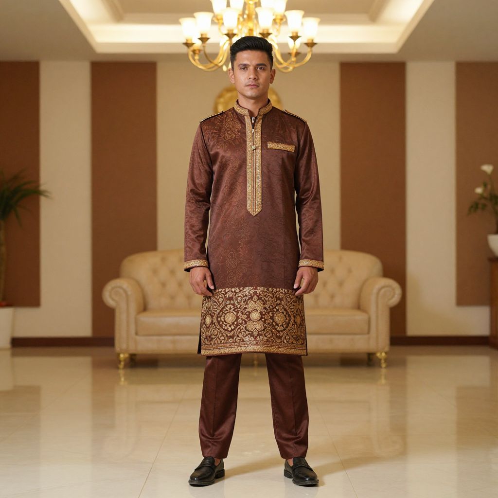 Photograph of a young South Asian man standing in a luxurious room, wearing a brown, intricately embroidered traditional kurtah and pyjamas,