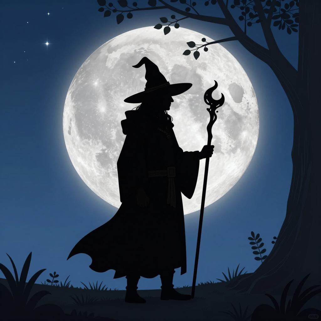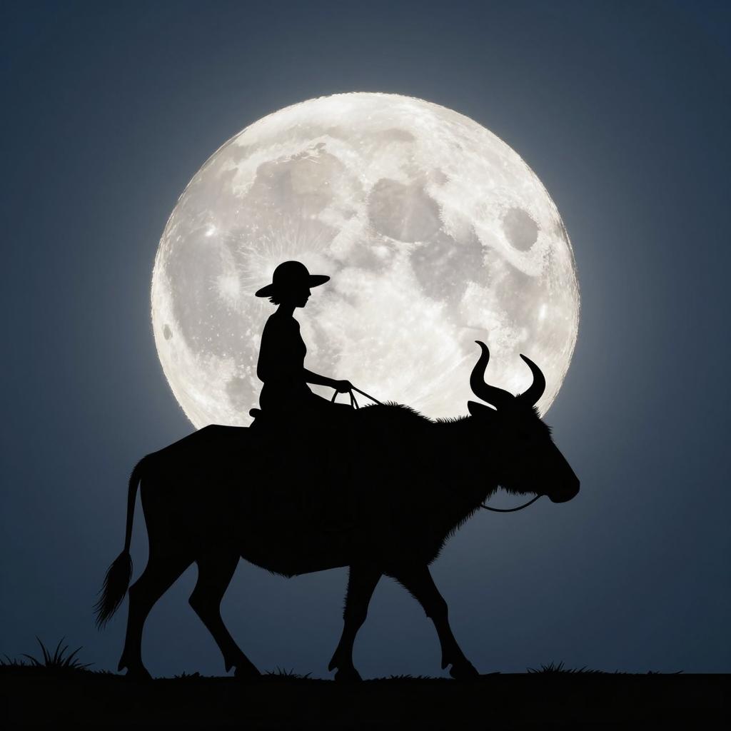 Silhouetted illustration of a person with a round hat riding a horned, pack-carrying animal against a bright full moon. The person leads the animal with a rope. Both figures are in the foreground, with blue and black background. Two people. The rider has a small, rounded hat. The animal has curved horns and a pack on its back.