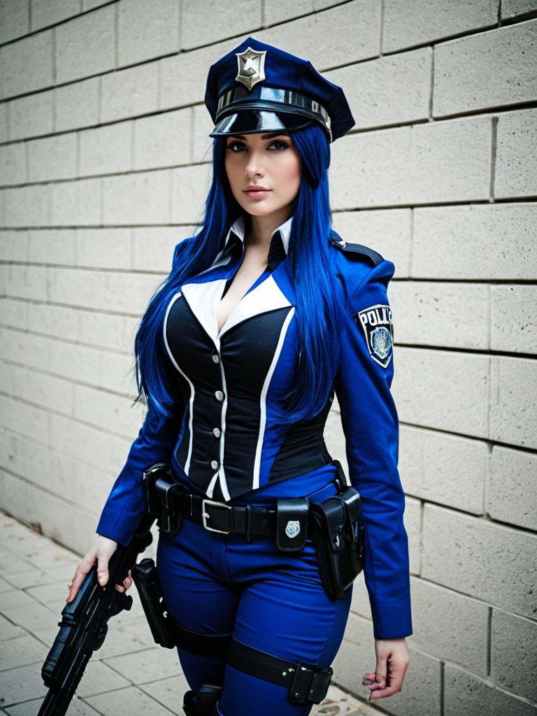 Photo-realistic cosplay photo of person in arcane caitlyn costume. 1girl, blue eyes, long hair, blue hair, black hair, medium breasts, policewoman. full body shot