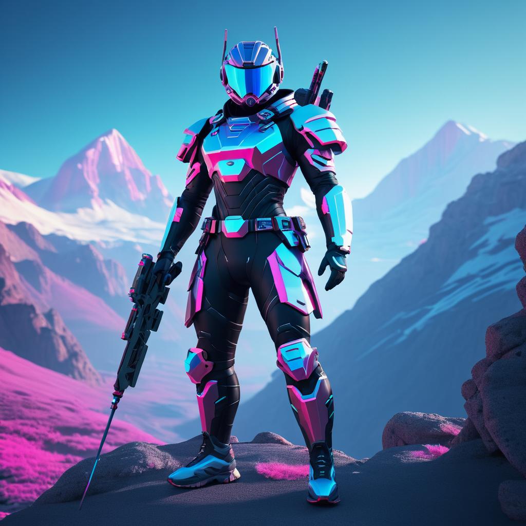 Futuristic Cyberpunk Warrior in Mountain Landscape