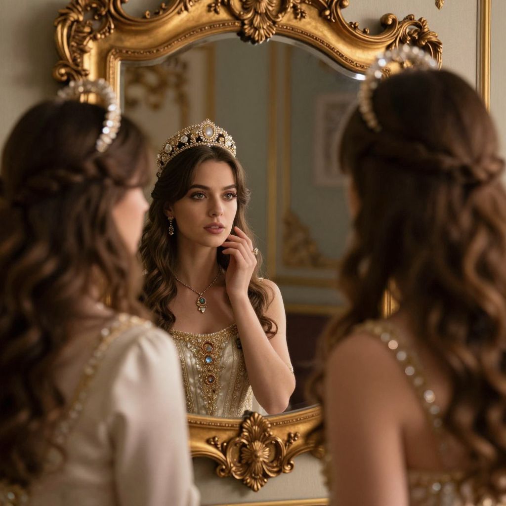 In a realm where mirrors transcend mere reflection, a woman adorned in regal elegance gazes into a golden frame that reveals not her own visage, but the life of another, as if the mirror itself holds the power to weave parallel worlds.