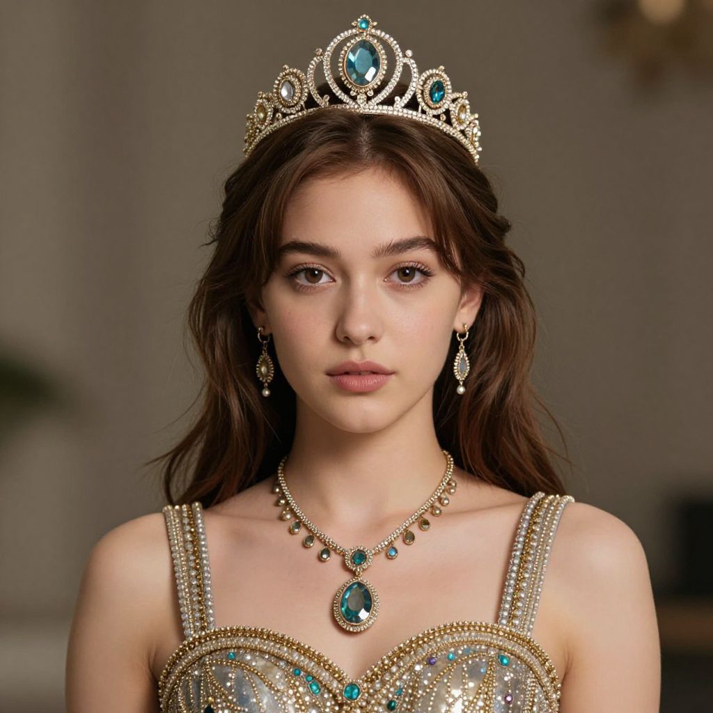 Photograph of a young woman with long, wavy brown hair, wearing a gold, ornate tiara and an elegant, strapless, gold-embellished gown. She stands in front of an elaborately framed, gold mirror, gazing at her reflection with a contemplative expression. The mirror's intricate design includes floral carvings and a curved top, reflecting her back and the room's soft, warm lighting. She touches her hair gently, highlighting her delicate features and the necklace she wears. The background shows a softly lit, classic interior with pale blue walls and gold accents.