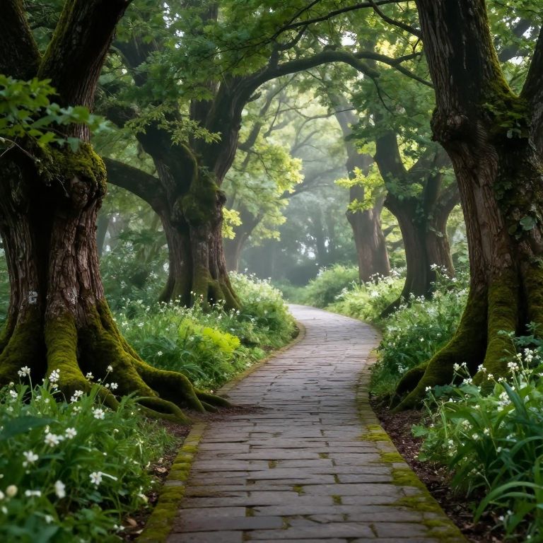 Moss-covered roots of ancient trees flank a winding stone pathway through a misty forest, where sunlight filters through dense foliage, casting dappled light on vibrant greenery and delicate wildflowers.