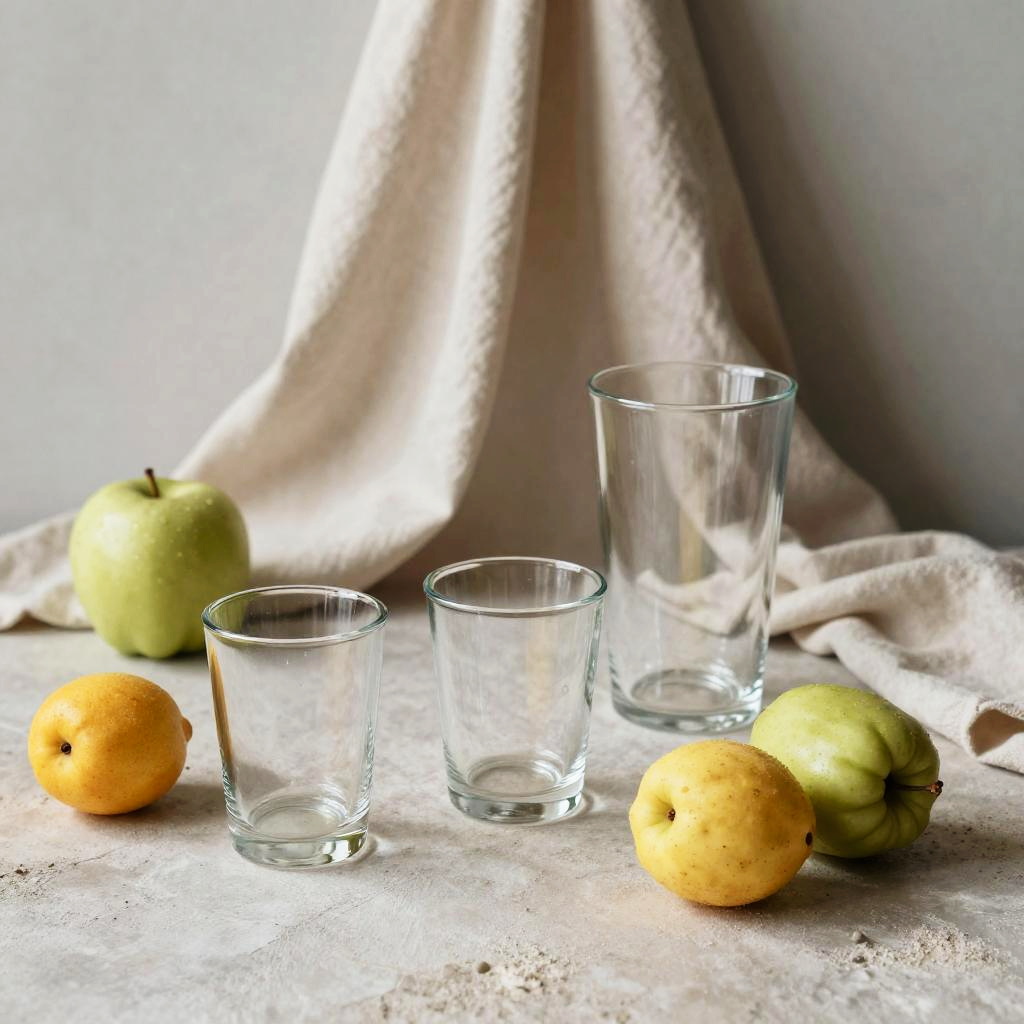This photograph features three clear glass cups of varying heights, positioned on a textured, light-gray surface. Surrounding the glasses are three green apples and two orange mandarins. One apple and one mandarin are placed on the left side, while the remaining apple and mandarin are on the right. The background includes a softly draped, beige cloth, creating a subtle, neutral backdrop. Natural light illuminates the scene from the left, casting soft shadows and highlighting the fruits' textures and colors. The overall composition is simple and minimalistic, emphasizing the fresh, natural elements and the clear, clean lines of the glasses.