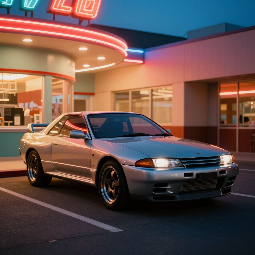 Vintage r32 gt-r parked near a retro diner on a quiet evening, warm neon signs illuminating the car, detailed reflections and chrome accents, nostalgic 90s urban style with soft lighting