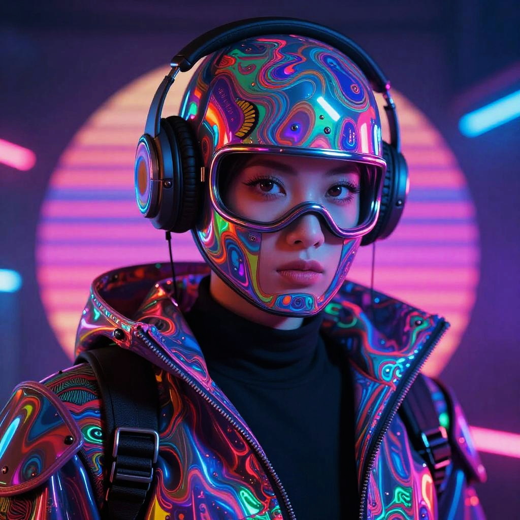 Realistic photo.80s neon cyberpunk warrior, vibrant holographic textures, psychedelic, high quality, digital painting, retro, punk, vibrant colors, neon lighting, oozing details, vintage, psychedelic art, futuristic fashion, mesmerizing eyes realistic photo