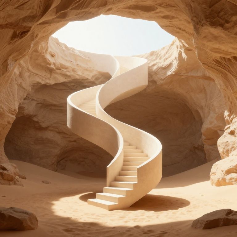 A surreal 3D-rendered scene depicts a floating, spiral staircase ascending through a sunlit desert cave, evoking a sense of mystery and abandonment with its minimalist design and ethereal lighting.