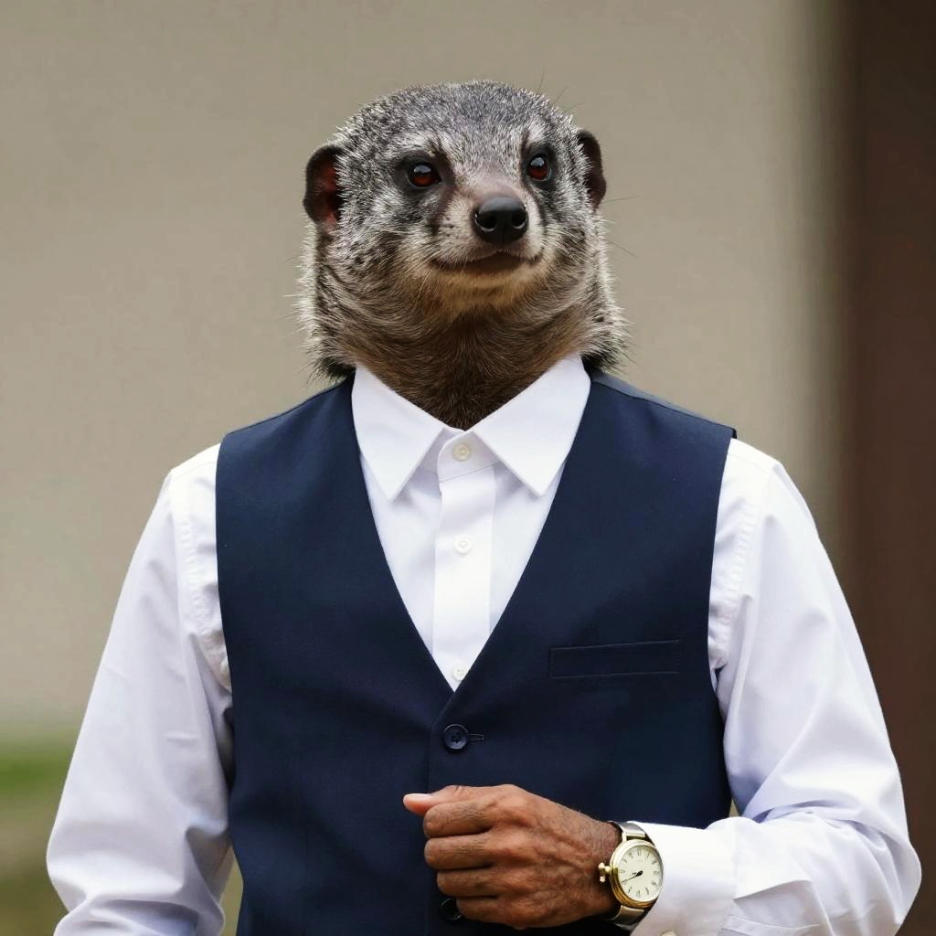 Photograph of a humanized leopard wearing a black suit, white shirt, and black tie, with a serious expression against a dark gray background.