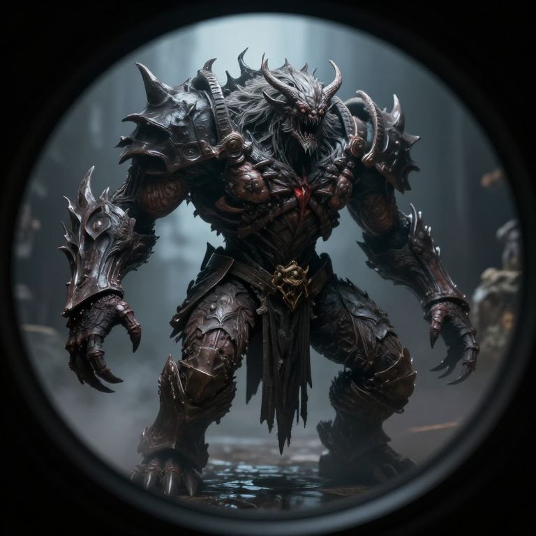A highly detailed digital CGI image of a fearsome, armored monster viewed through a circular lens. The creature has a muscular build, covered in dark, spiked armor with sharp, metallic claws. Its head is adorned with large, menacing horns, and a glowing red eye is visible through the armor. The background is a misty, dimly lit environment with blurred, indistinct objects. The monster stands in shallow water, reflecting its formidable presence. The overall color palette is dark, with metallic greys and blacks dominating the scene, creating a menacing and otherworldly atmosphere.