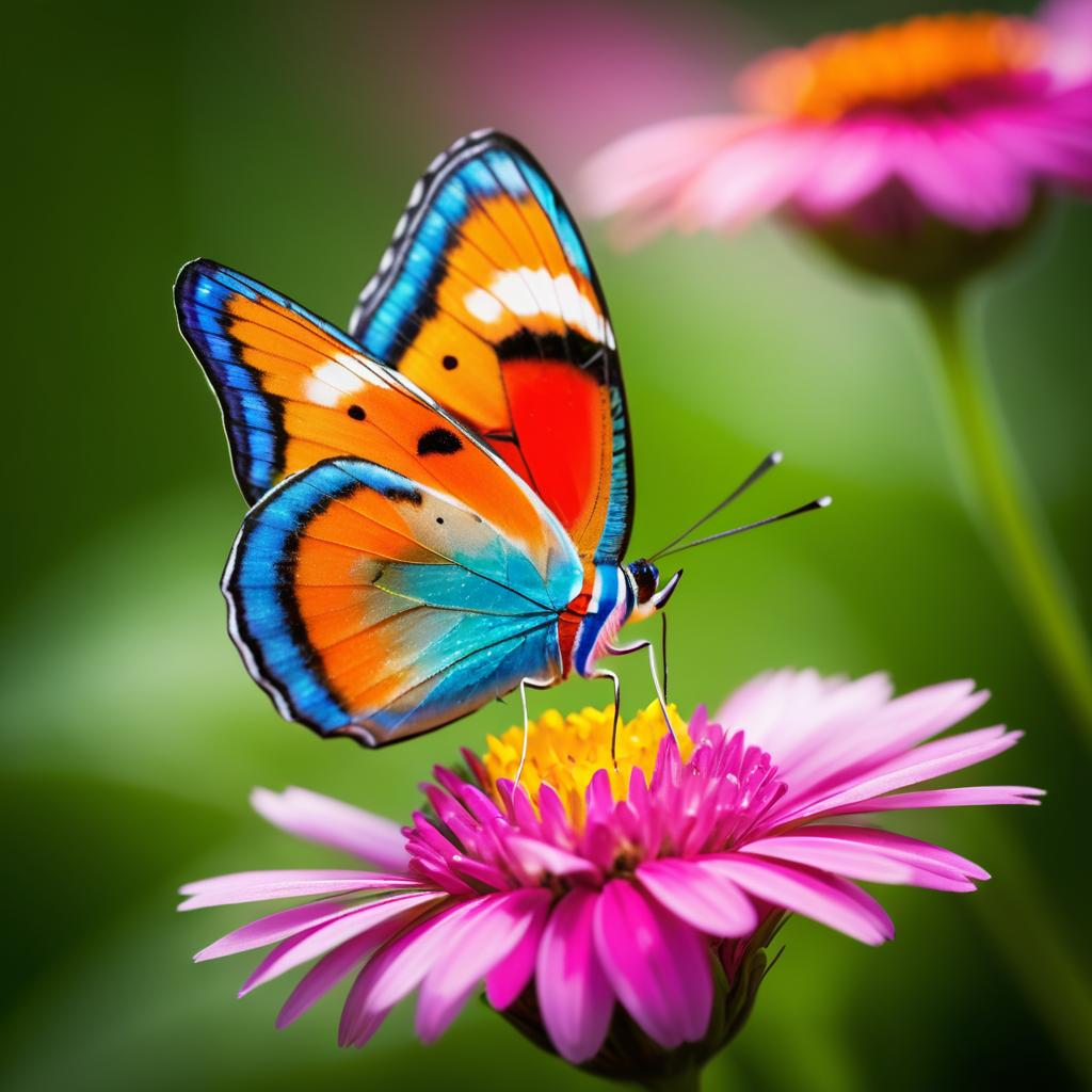 Macro lens photo of a vibrant butterfly resting on a flower, high resolution, realism, taken with a Canon 5D and 85mm lens, fantasy lighting.