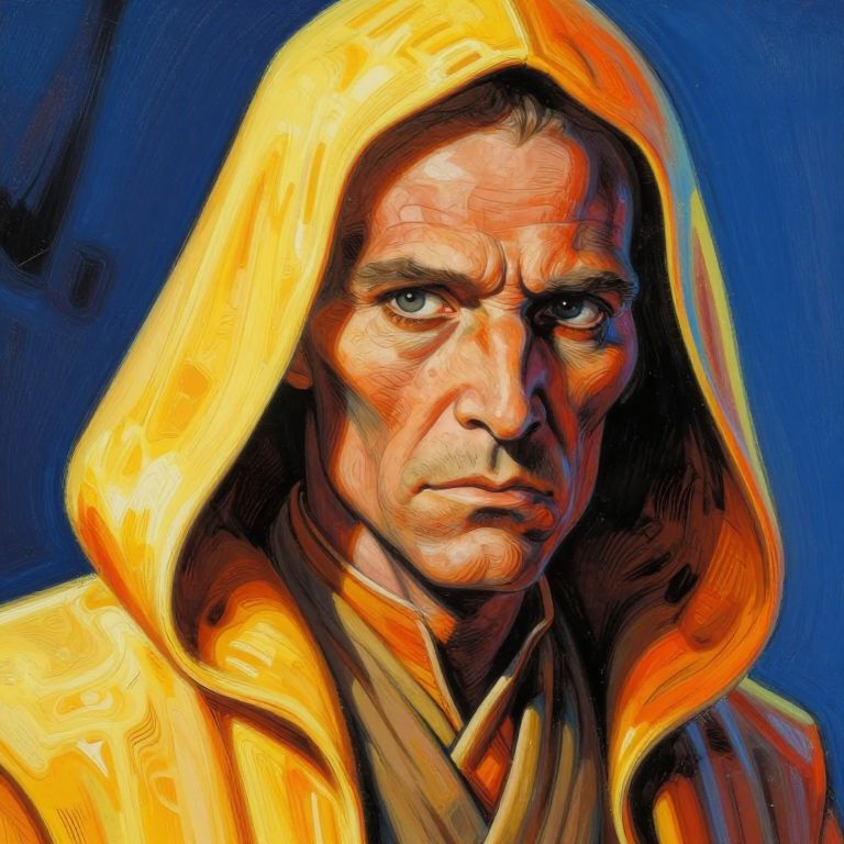 This digital painting in a vibrant, hyper-realistic style depicts a middle-aged man with a stern expression, wearing a bright yellow hooded cloak. His light blue eyes are intense and focused, and his weathered face is illuminated with bold, contrasting colors. The cloak's hood casts shadows over his forehead and nose, adding depth to his stern expression. The background is a deep, rich blue, which enhances the vividness of the yellow cloak. The man's skin tone is medium, and the painting uses thick, expressive brushstrokes to create a dynamic, almost painterly texture. The overall effect is dramatic and striking.