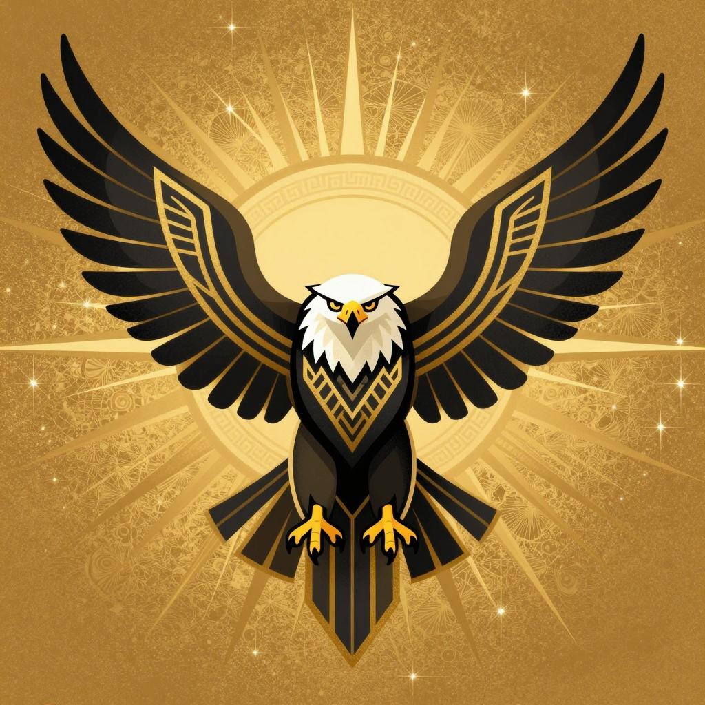 Majestic eagle illustration in digital style, featuring sleek lines, geometric shapes, and a rich color palette against a shimmering gold etched sunburst, inspired by Art Deco masters –ar 1:1 –q 2 –stylize 100