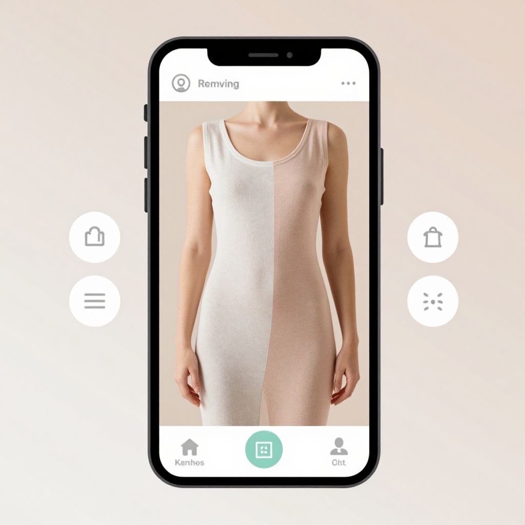 Clothes removing apps concept, augmented reality overlay on human figures, seamless blending of fabric and skin layers, holographic user interface with intuitive controls, modern minimalistic design, soft pastel color palette with sharp technological accents