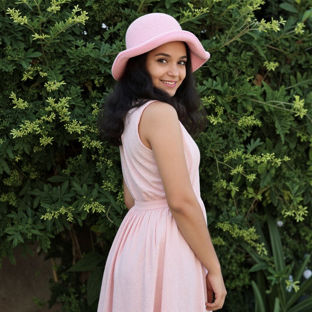 Boubou styles woman costume, 1girl, solo, hat, black hair, dress, arms behind back, smile, pink headwear, sleeveless, plant, standing, looking at viewer, long hair