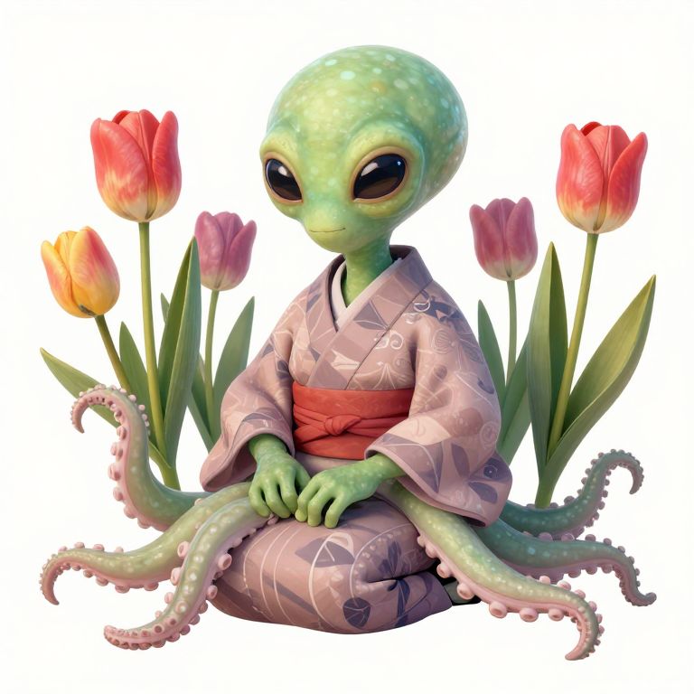 Digital illustration of a cute, green, extraterrestrial creature with large, black, almond-shaped eyes, sitting cross-legged. The creature wears a pink, floral-patterned kimono with a red sash and has multiple tentacles instead of legs. Behind it, five pink and orange tulips with green leaves are arranged in a semi-circle. The creature's smooth, light-green skin has a slight sheen. The background is plain white, making the colorful tulips and the pastel kimono stand out. The style is whimsical and cartoonish, with soft, vibrant colors and gentle shading.
