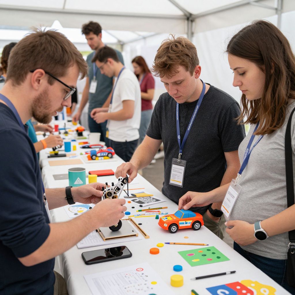 Photograph of four young adults in casual attire, wearing lanyards, examining colorful toy cars and educational materials at a table under a white tent.