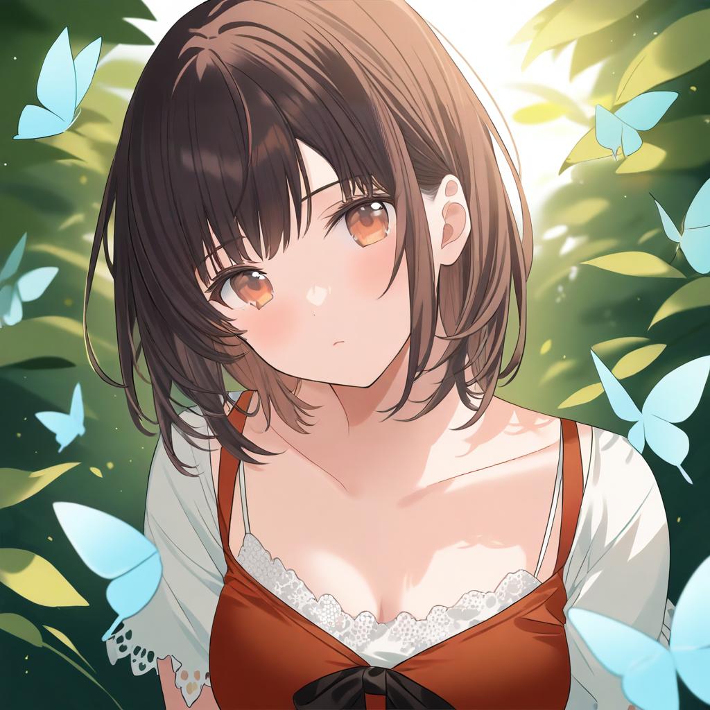 Anime-style digital illustration of a young girl with short brown and black hair and brown eyes, wearing a red dress with white lace trim and a white shirt underneath. She is surrounded by softly glowing blue butterflies and green foliage with sunlight filtering through the leaves.