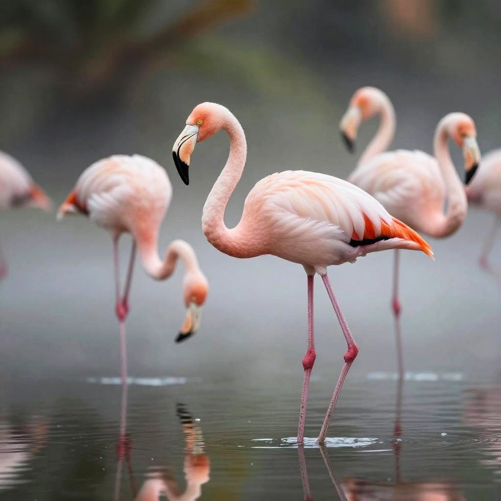 Graceful flamingo wading in shallow lagoon on tropical wetland with mist rising, in soft pastel colored bird photography; heroic stance, warm rim light, detailed textures and fine fur/skin, expressive eyes, atmospheric perspective, low-angle dramatic view, leading lines, balanced rule-of-thirds composition, soft background separation, high dynamic range feel, ultra sharp subject, natural color grade, subtle haze, microcontrast on edges, immersive realism, SDXL, 8k resolution