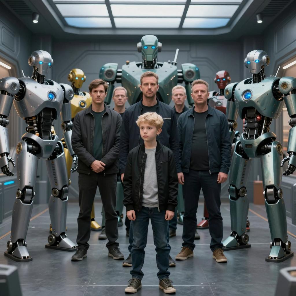 A young blonde boy wearing a black jacket and gray shirt stands in the foreground of a metallic, industrial room. Behind him are three adult men dressed in dark casual clothing, and several humanoid robots with metallic and green-blue exteriors, featuring glowing blue eyes and varied robotic designs. The ceiling features a large grid-like panel with blue lighting, illuminating the futuristic setting.