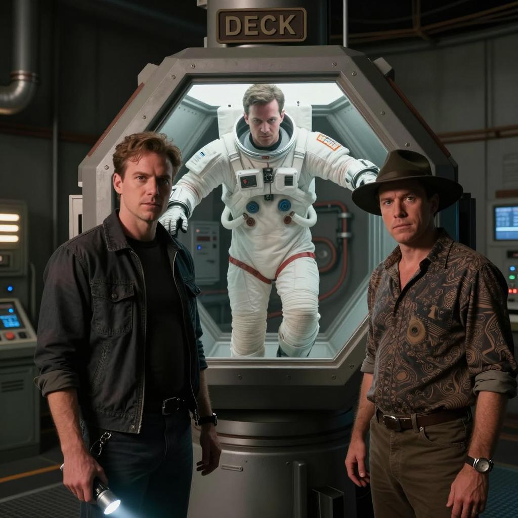 A group of people in a metallic, industrial-looking room with robotic figures. A young boy with short blonde hair, wearing a black jacket and gray shirt, stands in the foreground, looking to the left. Three men in dark clothing stand behind him. Multiple robotic figures with metallic and green-blue hues surround them. The ceiling has a grid-like structure with blue lighting. The boy's expression is neutral, while the men have focused or neutral expressions. The robots have varied designs, including humanoid and mask-like faces. Six people in total.