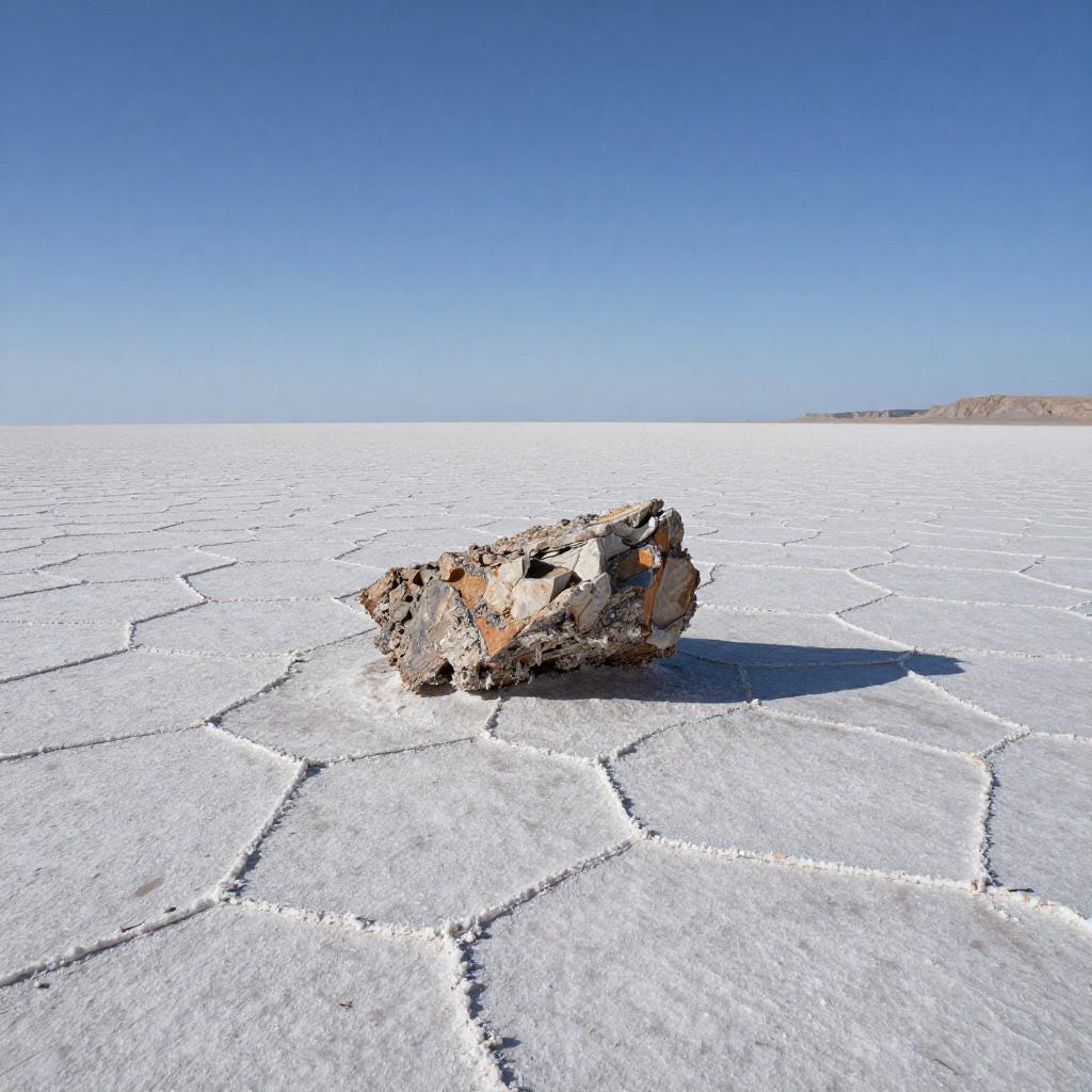 Panoramic photograph of a solitary dead tree on a cracked salt flat landscape with a clear blue sky. The minimalist scene features an empty horizon and distant mountain range, creating a surreal and stark natural setting.