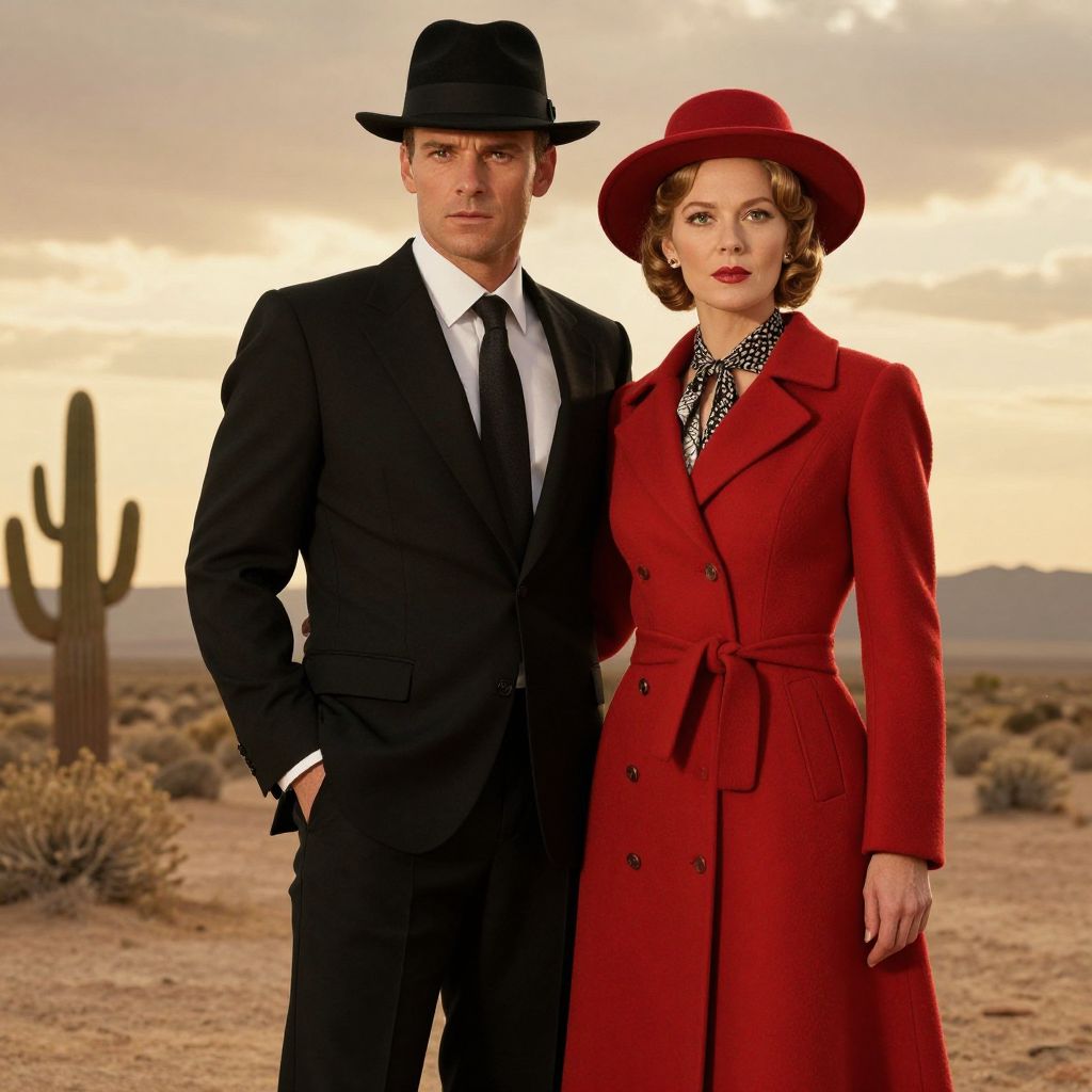 Photograph of a stylish, cinematic scene set in a desert with a cactus in the background. A tall, Caucasian man with a serious expression wears a black suit, white shirt, black tie, and black fedora. He stands with his right hand in his pocket. Beside him, a Caucasian woman with curly blonde hair, red lipstick, and a red hat, wears a vibrant red, double-breasted coat with a black and white polka dot scarf. The sky is overcast, casting a warm, golden light over the scene. The man's strong jawline contrasts with the woman's delicate features. The overall style is reminiscent of mid-20th century noir.