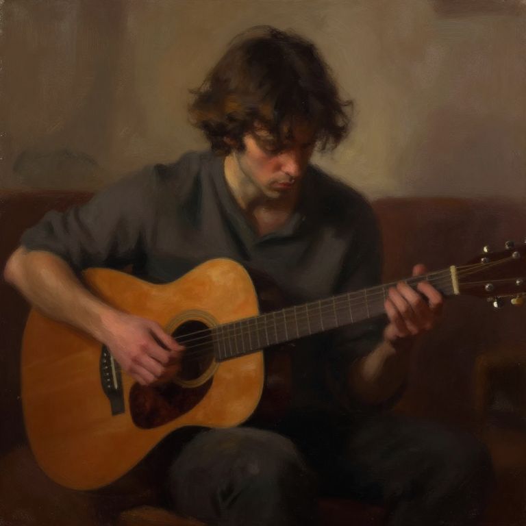 Sad guitarist painting, a melancholy musician playing an acoustic guitar in a dimly lit room, soft brush strokes capturing the emotion of solitude and reflection, warm muted colors blending with shadows, impressionistic style, evocative and emotional atmosphere.