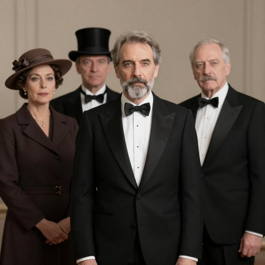 Photograph of a middle-aged man with gray hair and beard standing center, wearing a black tuxedo with a bow tie. Behind him are three people dressed in formal attire: a woman in a brown hat and dark coat, an older man wearing a black top hat and tuxedo, and another older man with gray hair and mustache also in a tuxedo. The background is a plain beige canvas. All subjects display intense expressions.