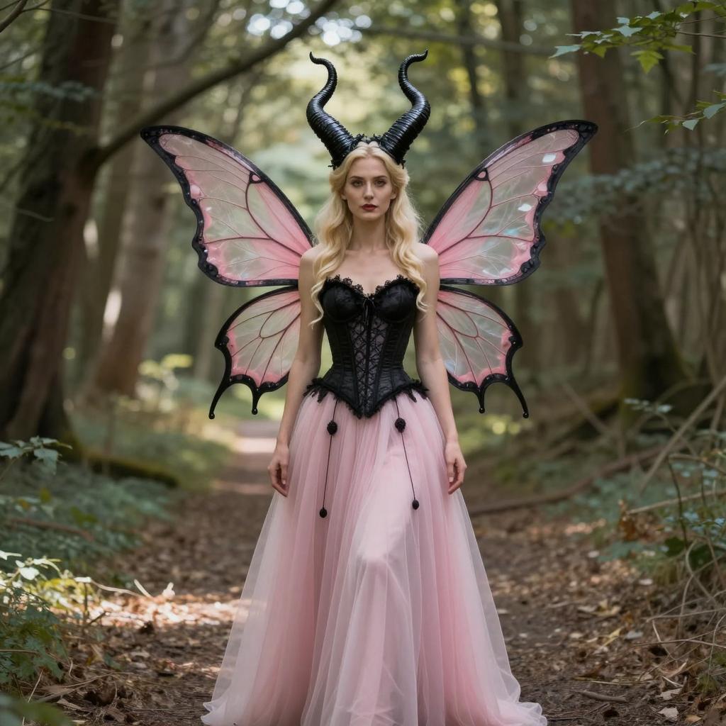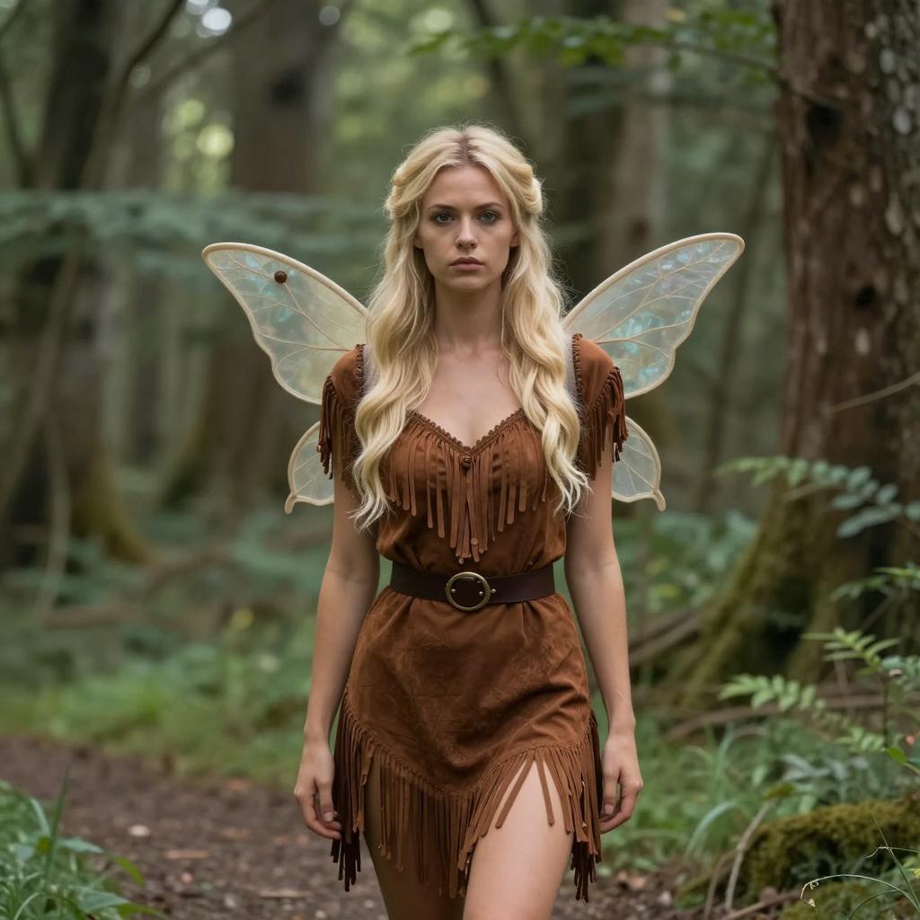 Photo of a blonde woman wearing a brown fringe dress and small translucent wings, standing in a daytime forest setting. The natural light filters through the trees, highlighting her serious expression. The background features green grass, blurred trees, and a forest path.