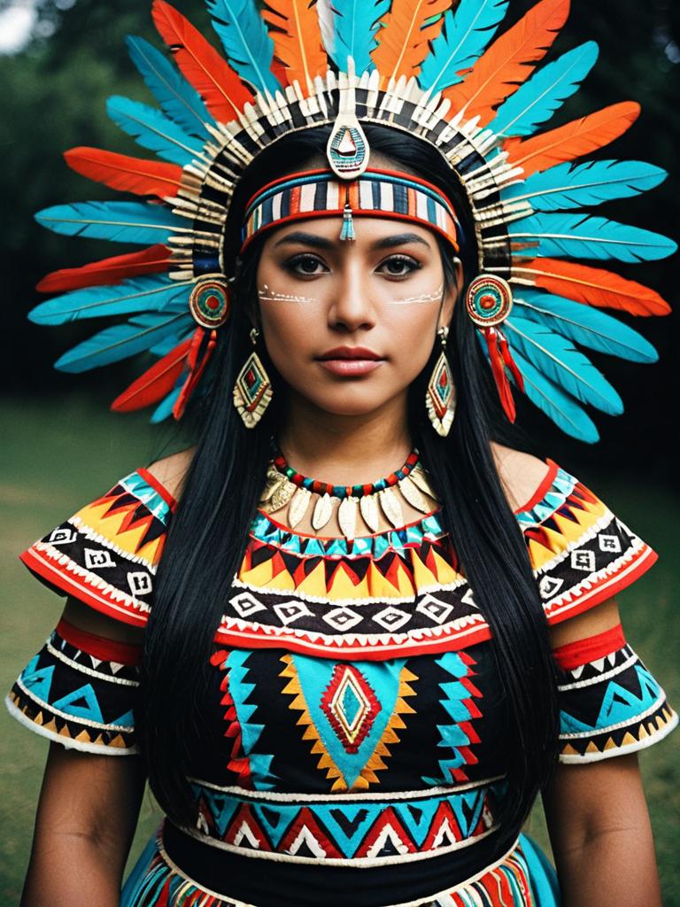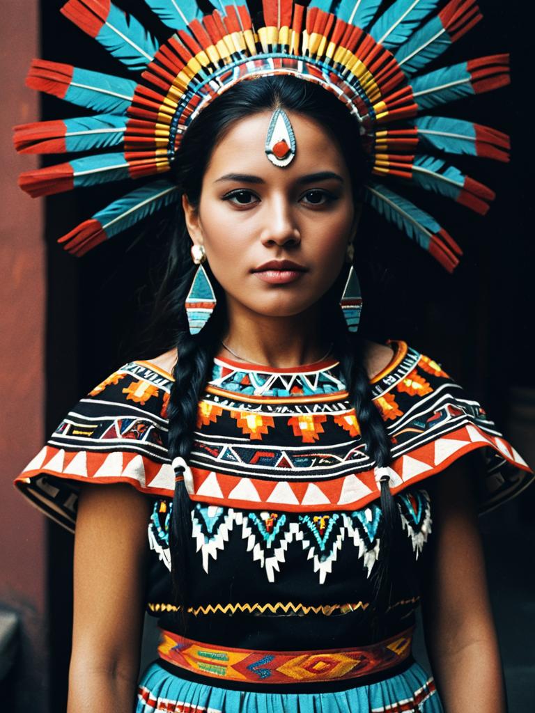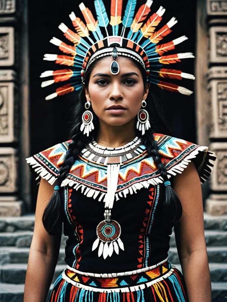 Woman in Aztec Princess Dress costume, cinematic realism, detailed professional portrait