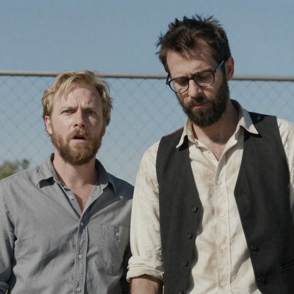 Photograph of three men with rugged appearances, standing in a dimly lit, brick-walled industrial setting. The man on the left has short blonde hair, a beard, and wears a green shirt. The middle man has dark hair, a beard, and wears a black jacket. The right man has curly dark hair, glasses, and a green shirt. They look upward with serious expressions.