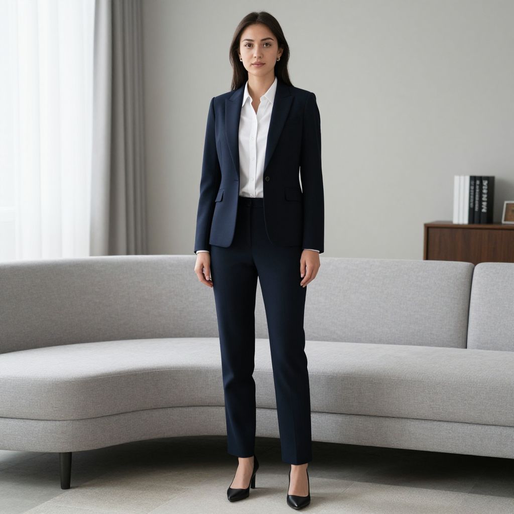 Photograph of a young woman with light olive skin and dark brown, straight hair standing in a modern, minimalistic living room. She wears a navy blue, tailored suit with a white dress shirt, and black high-heeled shoes. Her expression is neutral, with a slight frown. Behind her is a light gray, L-shaped couch with a textured fabric, and a dark wooden side table on the right holding a black and white book. The background includes a large window with white curtains, allowing natural light to illuminate the room.