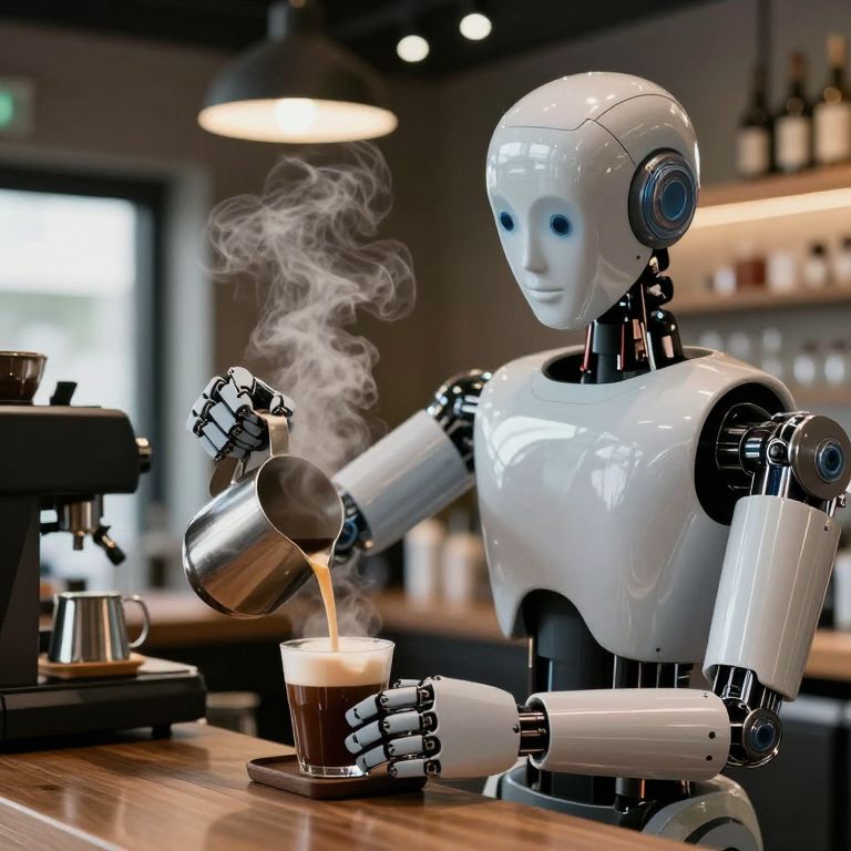 In a quiet café where technology meets humanity, a robot barista cradles a steaming cup, its mechanical hands stirring not just coffee but the ethereal dance of dreams and memories, as the warmth of the liquid mirrors the soul’s yearning for connection amidst the cold embrace of solitude.