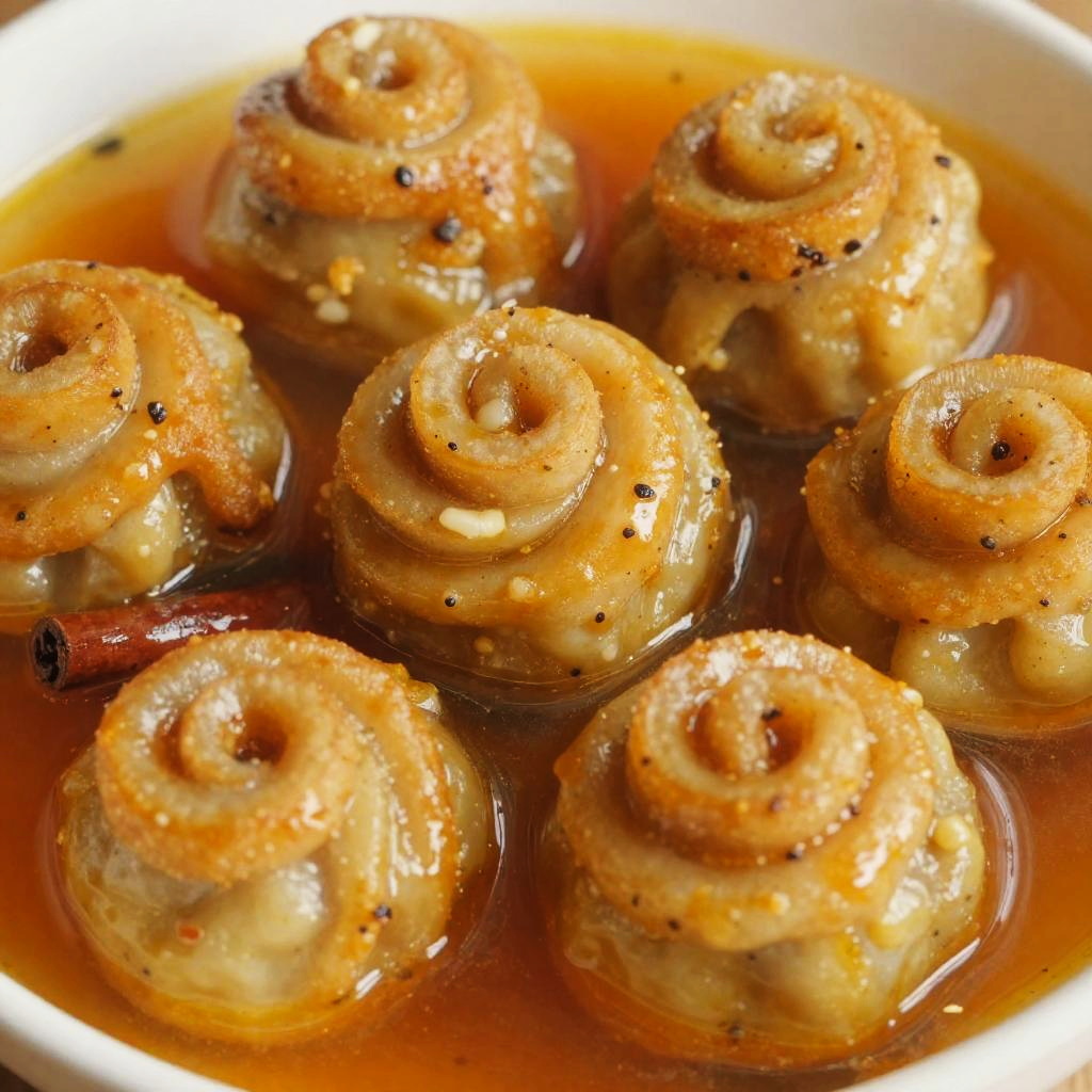 This close-up photograph showcases six golden-brown, spiral-shaped dumplings floating in a rich, amber-colored sauce. The dumplings are topped with a light sprinkling of black pepper and have a slightly glossy, caramelized crust. The sauce is thick and syrupy, pooling around the dumplings. The background is a simple white dish, highlighting the dumplings and sauce. The texture of the dumplings appears soft yet firm, contrasting with the smooth, glossy surface of the sauce. The image is brightly lit, emphasizing the golden brown color and the glistening sauce.